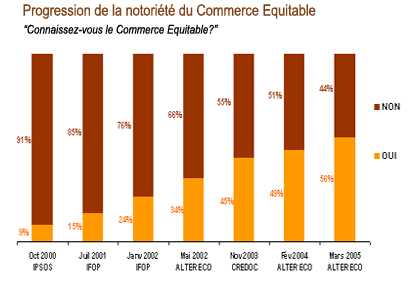 notoriété du commerce équitable se développe : Alors que 9% des Français déclaraient connaître ce concept en 2000, les études menées depuis montrent une progression très rapide de sa notoriété. Depuis 2004, plus d'un Français sur deux disent connaître le Commerce Équitable.